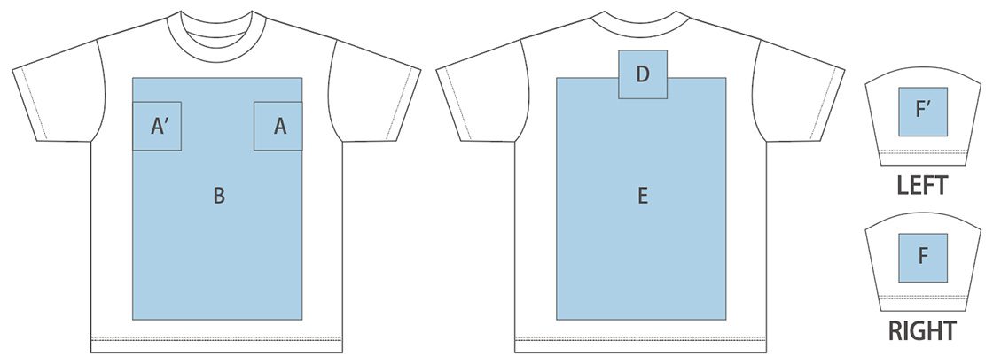 ※プリント可能なエリアや面積は手法によっても異なります。表示以外のエリアへのプリントについてはお問合せください。
