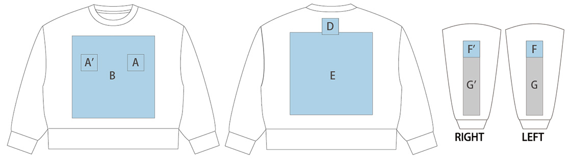 ※プリント可能なエリアや面積は手法によっても異なります。表示以外のエリアへのプリントについてはお問合せください。