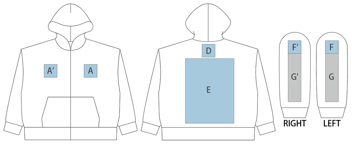 ※プリント可能なエリアや面積は手法によっても異なります。表示以外のエリアへのプリントについてはお問合せください。