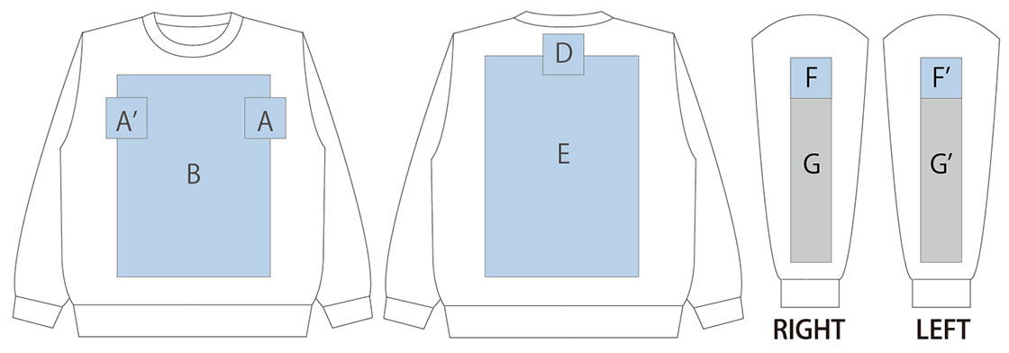 ※プリント可能なエリアや面積は手法によっても異なります。表示以外のエリアへのプリントについてはお問合せください。