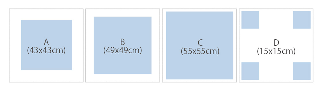 | エリア別加工適正 | A(43x43cm) | B(49x49cm) | C(55x55cm) | D(13x13cm) |